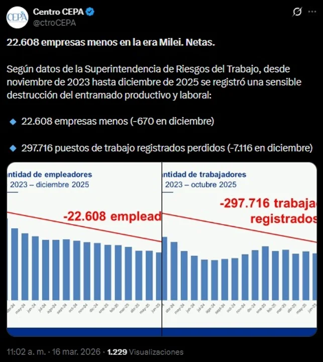 Según supo la Agencia Noticias Argentinas, en una publicación en redes sociales el Centro de Economía Política Argentina (CEPA) advirtió que bajaron sus persianas 22.608 empresas, según datos de la Superintendencia de Riesgos del Trabajo.__IP__