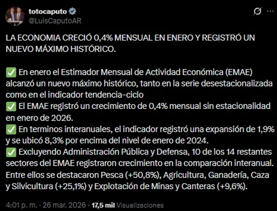 “En enero, el Estimador Mensual de Actividad Económica (EMAE) alcanzó un nuevo máximo histórico, tanto en la serie desestacionalizada como en el indicador tendencia-ciclo”, afirmó Caputo y añadió que “el EMAE registró un crecimiento de 0,4% mensual sin estacionalidad en enero de 2026”.