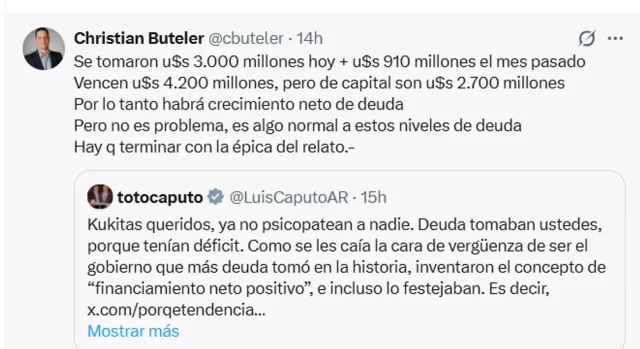 “Se tomaron US$ 3.000 millones más US$ 910 millones el mes pasado (con el BONAR2029). Vencen US$ 4.200 millones, pero de capital son US$ 2.700 millones Por lo tanto, habrá crecimiento neto de deuda. Pero no es problema, es algo normal a estos niveles de deuda. Hay que terminar con la épica del relato”, lanzó Christian Buteler.