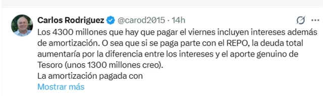 En un sentido similar se pronunció Carlos Rodríguez, ex asesor del presidente Javier Milei: “Los 4300 millones que hay que pagar el viernes incluyen intereses además de amortización. O sea que si se paga parte con el REPO, la deuda total aumentaría por la diferencia entre los intereses y el aporte genuino de Tesoro (unos US$ 1300 millones)”.