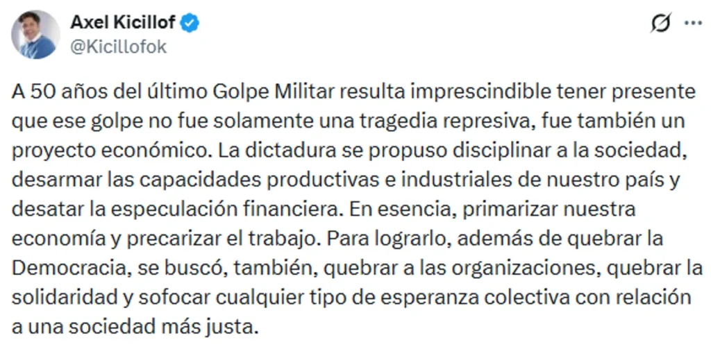 Por la mañana, y desde sus redes sociales, Kicillof publicó un mensaje sobre esta efemérde y remarcó la importancia de recordar esta fecha “no para quedarnos en el pasado” sino “para cuidar la democracia”.