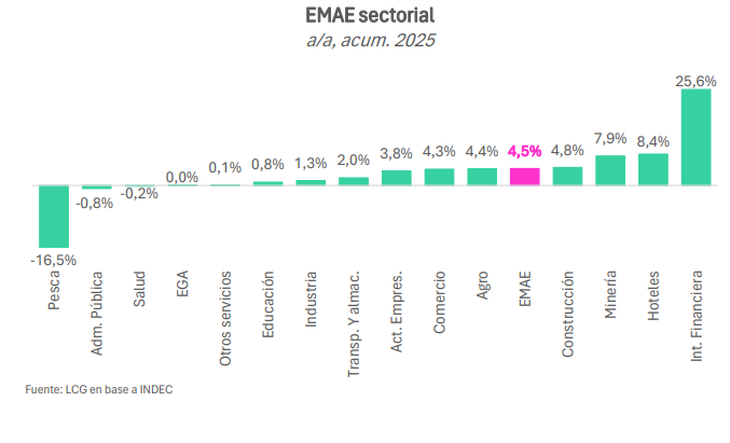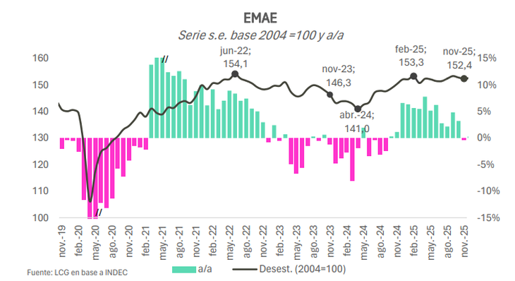El acumulado de 2025 muestra un crecimiento económico del 4,5%, explicado por la baja base de comparación de 2024, donde la recesión de los primeros meses pegó fuerte. Sin embargo, la consultora LCG aclaró que «desde el pico de febrero la actividad cayó 0,6% desestacionalizado, mostrando que durante 2025 prácticamente no hubo crecimiento (+0,2% respecto a diciembre de 2024).