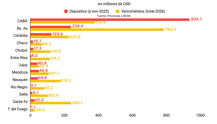 “A nivel agregado, los trece subnacionales con títulos en dólares registraban a noviembre de 2025 depósitos por u$s1.507 millones, frente a vencimientos en moneda extranjera por u$s2.479 millones durante 2026”, dice el informe.