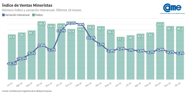 Al analizar el escenario relevado, desde CAME sostuvieron que “diciembre funcionó como un alivio financiero gracias a las fiestas de fin de año y al cobro de aguinaldos, pero no logró revertir la caída estructural del 5,2%”.