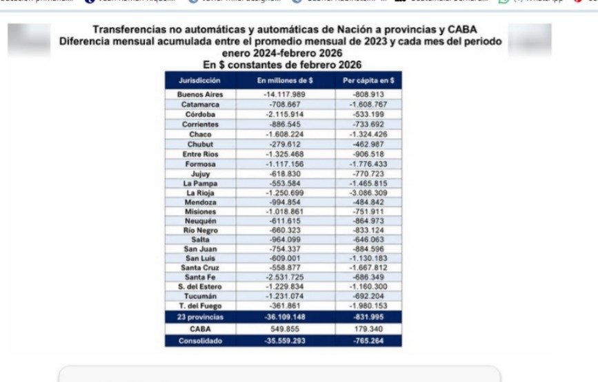 Por un lado, el reporte señala que “la pérdida acumulada entre enero de 2024 y febrero de 2026 con relación al monto promedio mensual de 2023 de transferencias no automáticas de Nación al consolidado de 23 provincias fue de $20,5 billones en moneda de febrero 2026”.