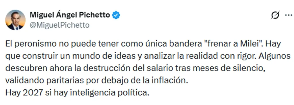 «El peronismo no puede tener como única bandera «frenar a Milei». Hay que construir un mundo de ideas y analizar la realidad con rigor. Algunos descubren ahora la destrucción del salario tras meses de silencio, validando paritarias por debajo de la inflación. Hay 2027 si hay inteligencia política«, manifestó desde sus redes sociales.