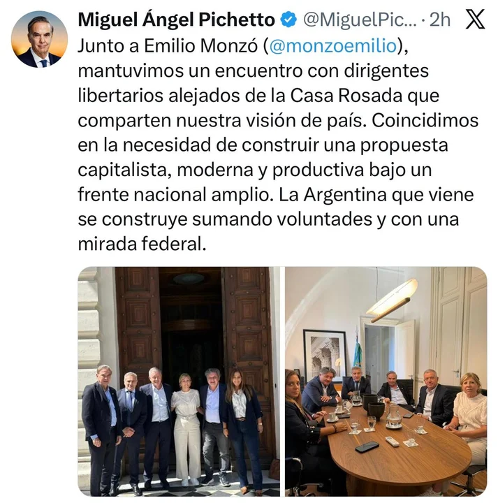 “Junto a Emilio Monzó, mantuvimos un encuentro con dirigentes libertarios alejados de la Casa Rosada que comparten nuestra visión de país”, escribió Pichetto en su cuenta de X, constató la Agencia Noticias Argentinas. __IP__